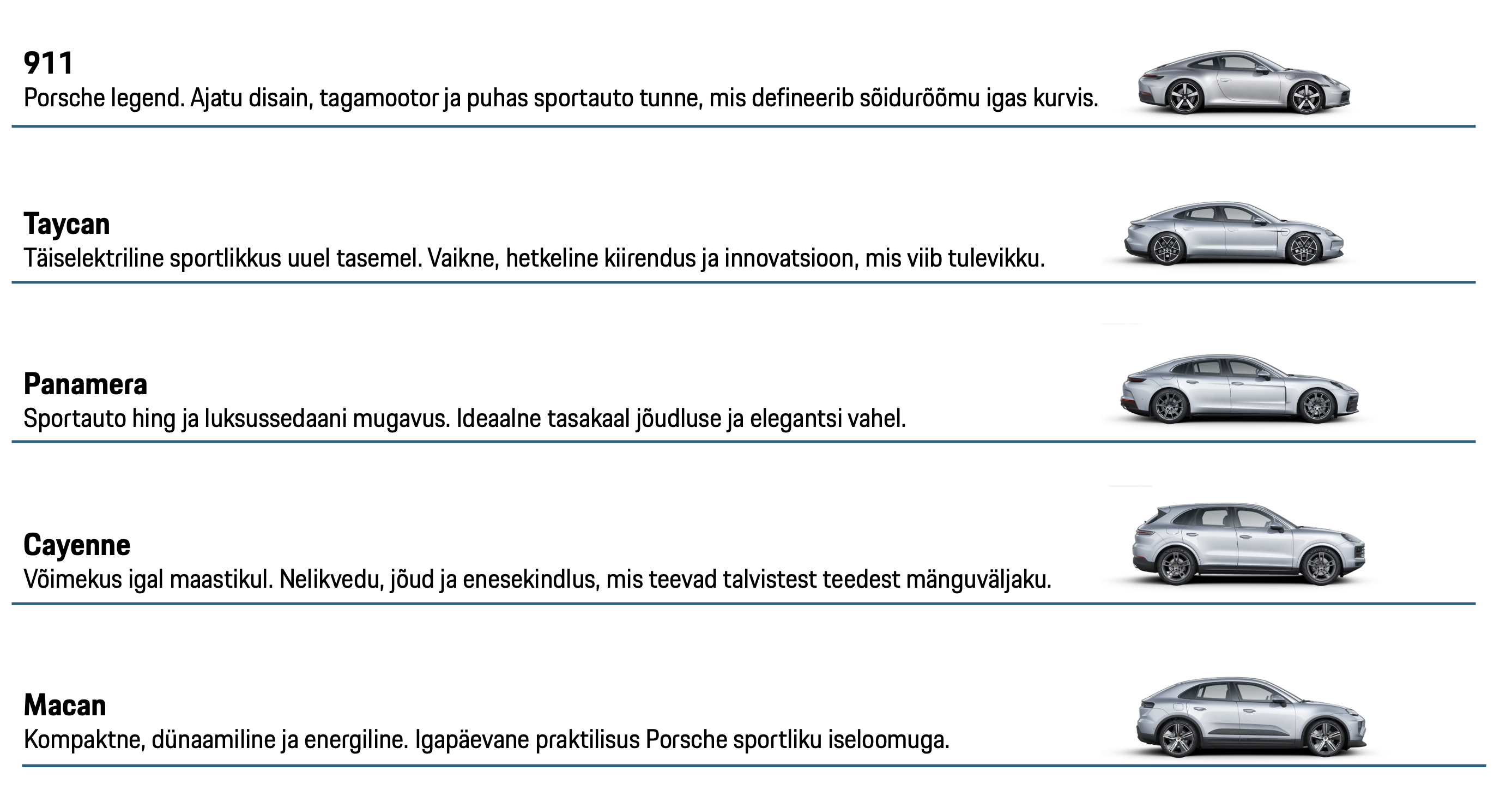 Porsche on enam kui auto – see on elustiil. See on tunne, mis algab esimesest süütenupust ja kestab veel pikalt ka pärast viimast kilomeetrit.