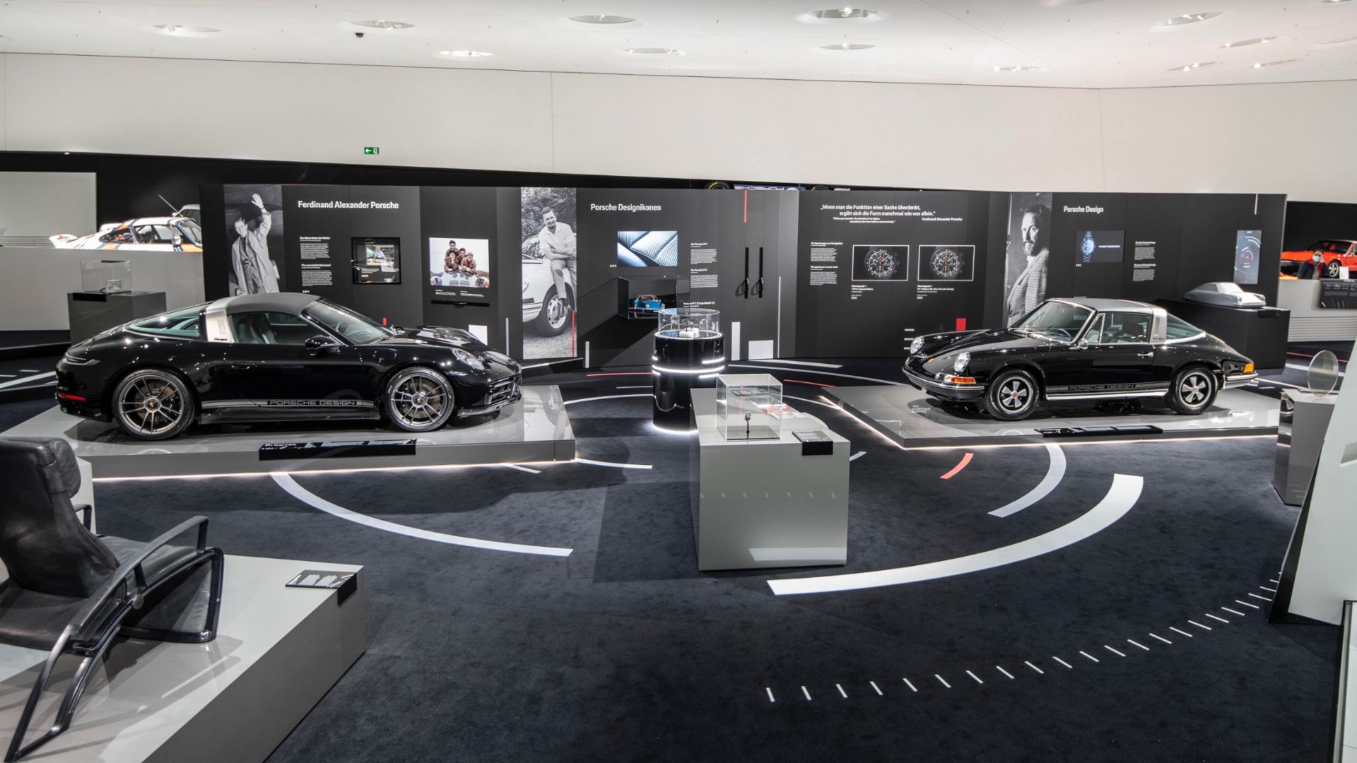Porsche Designi sündi sümboliseerib Chronograph I, eriväljapaneku keskmes ongi legendaarse ajanäitaja kaks versiooni. Sellest keskmest kiirgub disainikontseptsioon edasi ka teiste eksponaatideni. Nende hulka kuuluvad näiteks piloodi päikeseprillid P8478, käekellade seeria Monobloc Actuator, millel on stopperi täielikult integreeritud surunupud, piip P3613 ja mobiiltelefon P9521. Porsche muuseumi rõdul paiknevate eksponaatide seas on F. A. Porschele endale kuulunud 993 Speedster ja 904, mida ta ise nimetas oma meistriteoseks. Eriväljapaneku osadeks on samuti Porsche Classicu restaureeritud 1972. aasta 911 S 2.4 Targa ja uus 911 Edition 50Y Porsche Design.