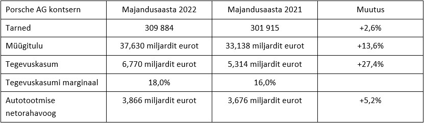 Dr. Ing. h.c. F. Porsche AG lõpetas 2022. majandusaasta nelja uue rekordiga. Kontserni müügitulu aastal 2022 oli 37,6 miljardit eurot, mis teeb kasvuks 13,6 protsenti (2021: 33,1 miljardit eurot). Kontserni tegevuskasum oli 6,8 miljardit eurot, ületades aastataguse tulemuse 1,5 miljardi euroga (kasv 27,4 protsenti). Tarnete arv ja autotootmise netorahavoog jõudsid samuti 2022. aastal kõigi aegade kõrgeimale tasemele. Kontserni tegevuskasumi marginaal kasvas 16,0 protsendilt 18,0 protsendini. Tänavu läheb Stuttgardi sportautotootja oma modernse luksuse strateegiaga edasi ning on pikaajalise kasumieesmärgi saavutamiseks alustanud ambitsioonikat programmi Road to 20.