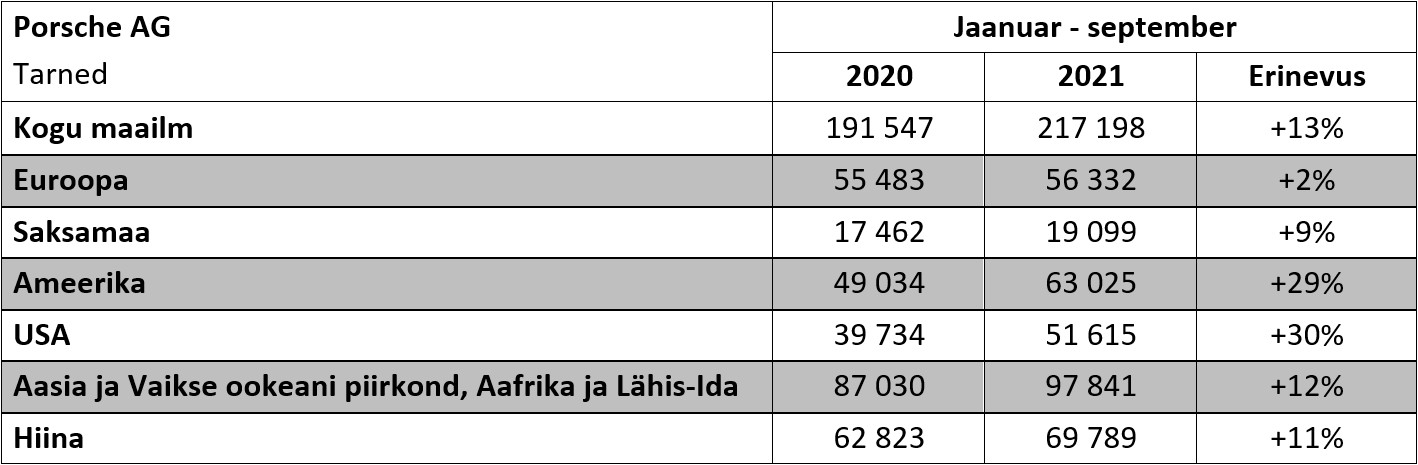 Kolme kvartali rekordtulemus: 2021. aasta jaanuarist septembrini tarnis Porsche oma klientidele kogu maailmas 217 198 sõidukit. See on sportautotootjale 13-protsendiline kasv. Nõudlus kasvas kõigis müügipiirkondades, eriti suur kasv registreeriti USA piirkonnas.