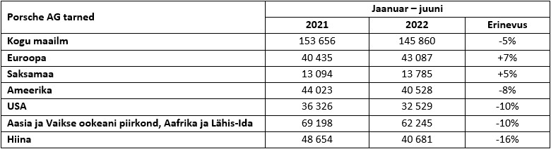 Turuolukord maailma eri osades oli esimesel poolaastal erinev ning väga erinevad olid seetõttu ka tarnete arvud. Euroopas kasvas tarnitud sõidukite hulk 43 087-ni. See tähendan seitsmeprotsendilist kasvu võrreldes niigi tugevate mulluste näitajatega. Sama kehtib Porsche koduturu Saksamaa kohta. 2022. aasta esimese kuue kuuga tarnitud 13 785 sõidukit märgib eelmise aastaga võrreldes viieprotsendilist kasvu. Hiinas suutis Porsche klientidele tarnida 40 681 sõidukit vaatamata kuudepikkusele karantiinile mitmetes linnades. Tarnete arv langes siiski 16 protsenti eelmise aasta sama ajaga võrreldes. Ent vaadates kogu noobel- ja luksusautode segmendi langust Hiinas (jaanuarist maini 23 protsenti), saavutas Porsche oma suurimal üksikturul siiski muljetavaldava tulemuse. Porsche klientidele Aasia ja Vaikse ookeani piirkonnas, Aafrikas ja Lähis-Idas tarniti kokku 62 245 sõidukit. USA-s tarnis Porsche oma klientidele 32 529 sõidukit, ehkki pidi silmitsi seisma transpordiprobleemidega. See tulemus saavutati mulluse, kõigi aegade parima esimese poolaasta taustal.